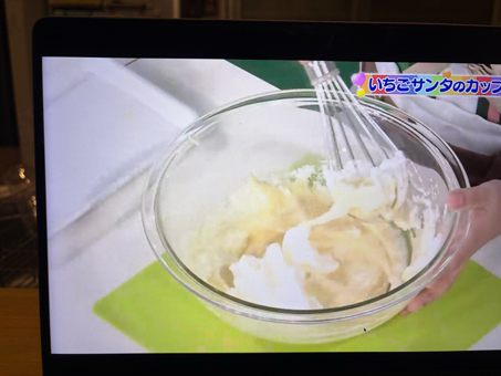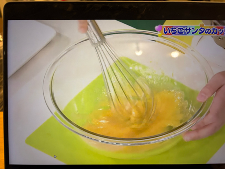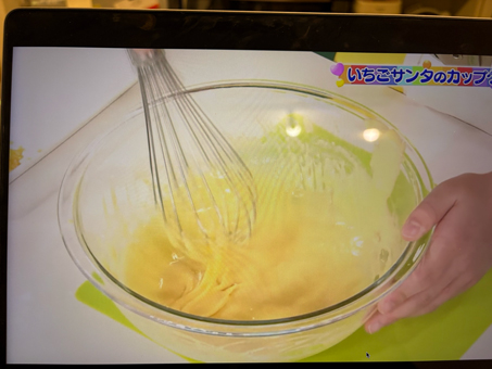 - メレンゲを作るよ。卵の白身をボウルに入れて、ハンドミキサーで泡立てていく。砂糖を3回に分けて入れて、その都度よく泡立てる。角が立つようになったらオッケー。