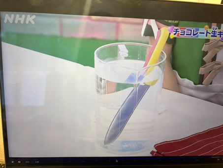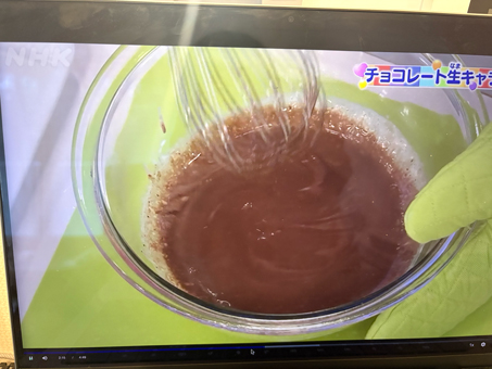 - 先ほどのチョコ液を入れて、耐熱ゴムベラで混ぜる。