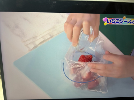 - 苺のヘタを切って食品用の袋に入れて、砂糖を入れる。袋に穴が開かないように注意しながら揉む。